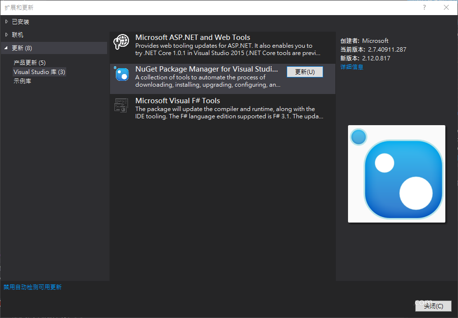 2、在左边找到更新,选择VS库就会看见NuGet 包管理器更新。直接点击更新后会开始下载。