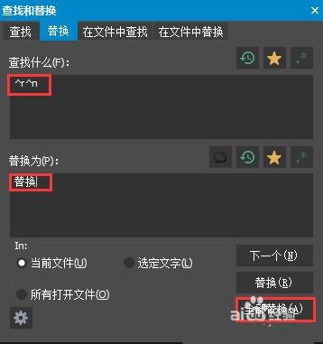 4、弹出查找和替换窗口,在查找什么中输入^r^n,在替换为中输入替换