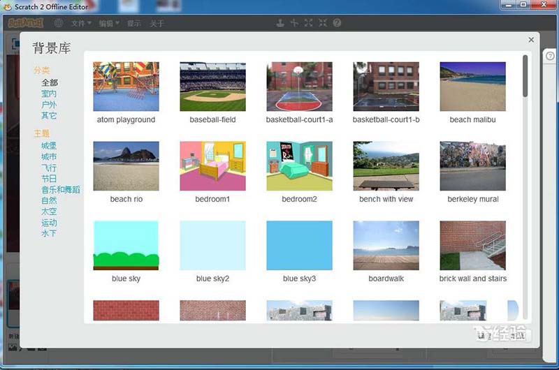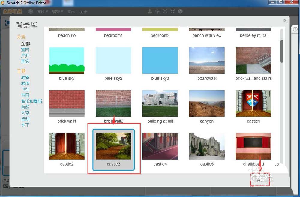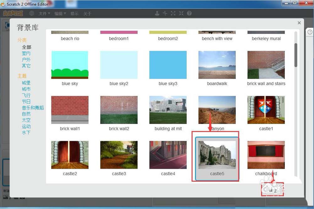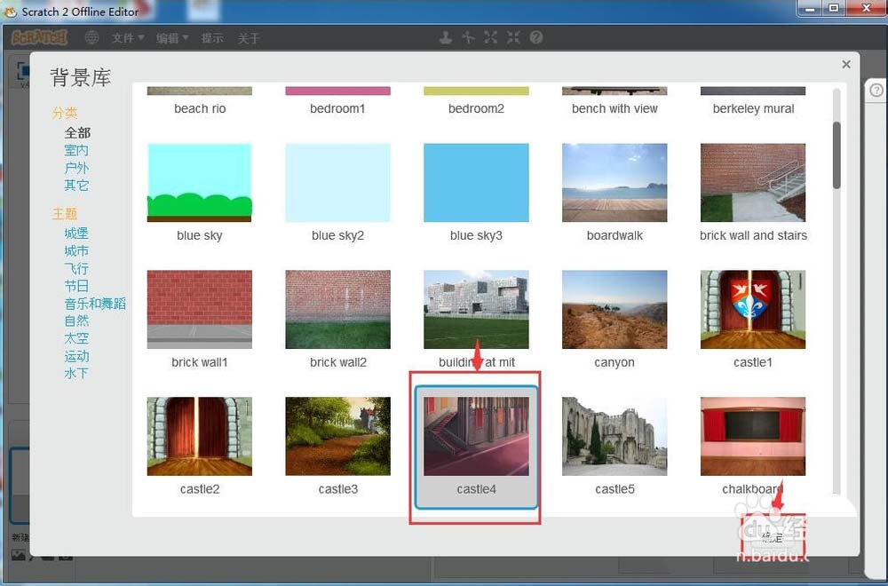 4、进入scratch的背景库后,先选择一个背景图,然后按确定;