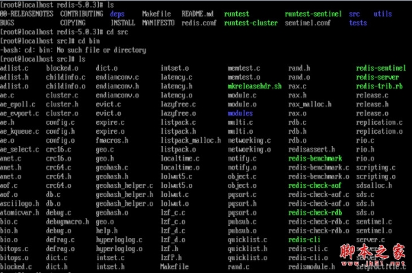 redis-5.0.5 的目录结构如下,进入 src 目录后执行 make install(很快)