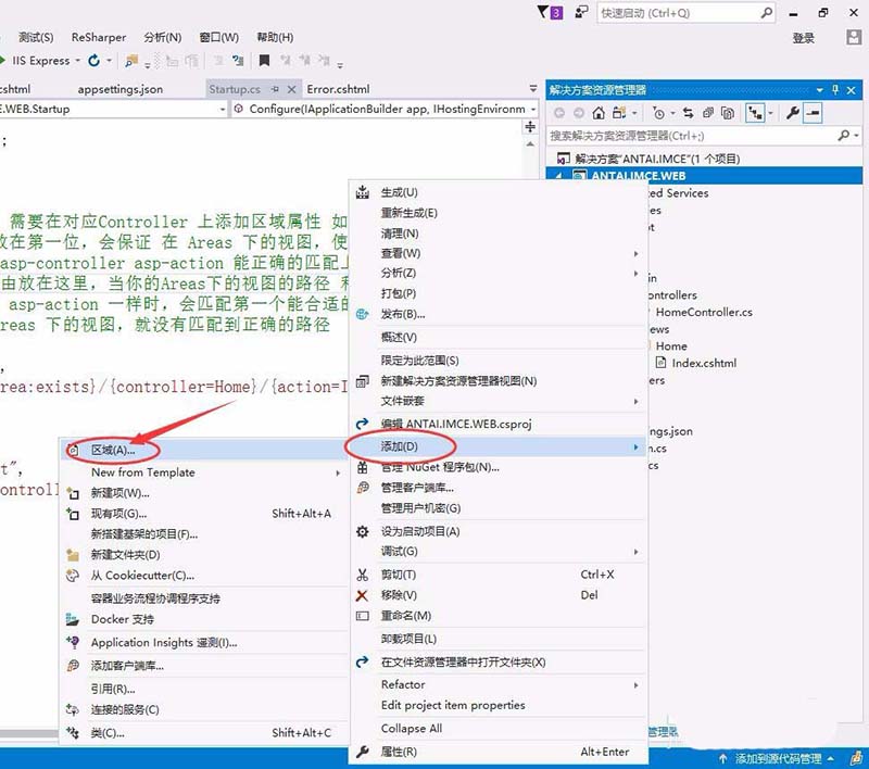 8、重启完电脑后,我们再次打开VS 2017,在项目中右键就可以发现“区域Area”选项了,如下图所示: