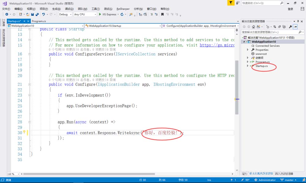 6、打开Startup.cs文件,修改输入内容,如下图所示: