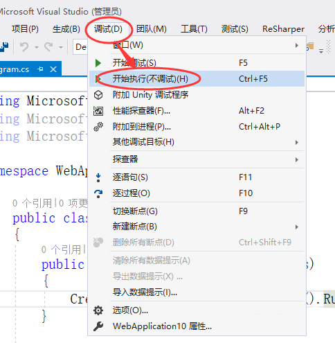 7、依次点击菜单栏中的“调试”->“开始执行(不调试)”,如下图所示: