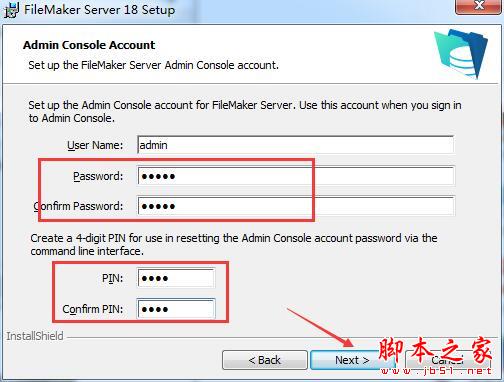 10、需要设置FileMaker Server的管理控制台帐户,输入一个4位数的PIN,用于通过命令行界面重置管理控制台帐户密码。输入和确认输入密码!