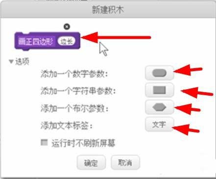 3、填写积木名称,给积木加参数,有四种参数可以添加,分别是:数字型、字符串型、布尔值、文本,这里添加数字型;