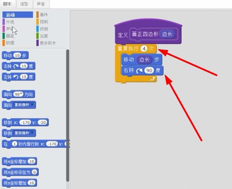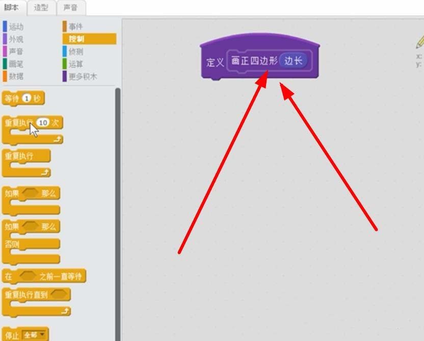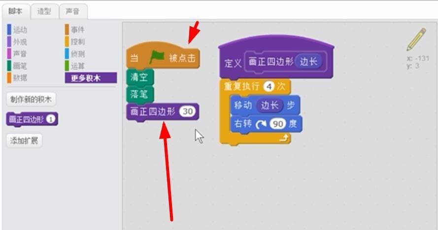 5、给新积木加脚本,让新积木具备画正方形的功能;
