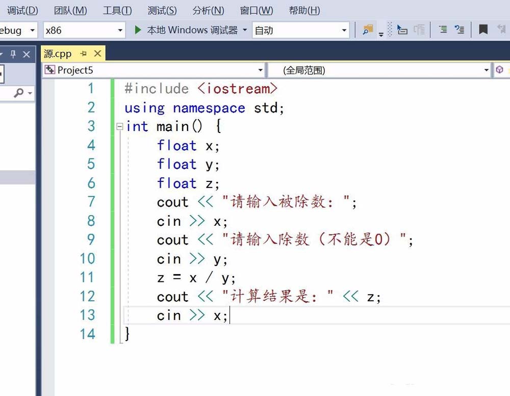 9、使用cout和cin语句,输入两个浮点型数字,这是用来相除的数字,其中x是被除数,y是除数。