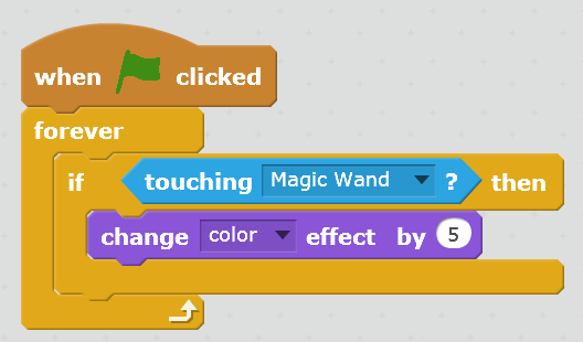 4、编辑爱心的脚本,先判断魔法棒是否有碰到爱心。