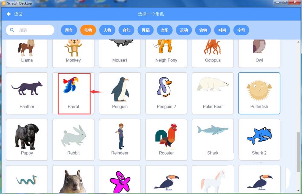 4、进入选择一个角色页面中,点击动物类别中的鹦鹉;