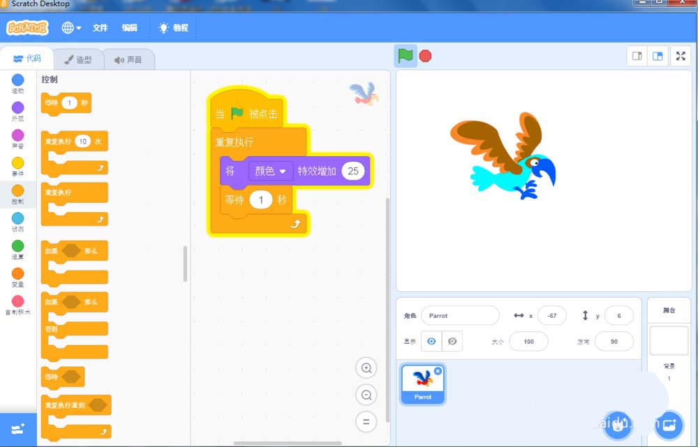 6、给鹦鹉添加如下脚本,由将颜色特效增加25,等待1秒和重复执行命令组成;