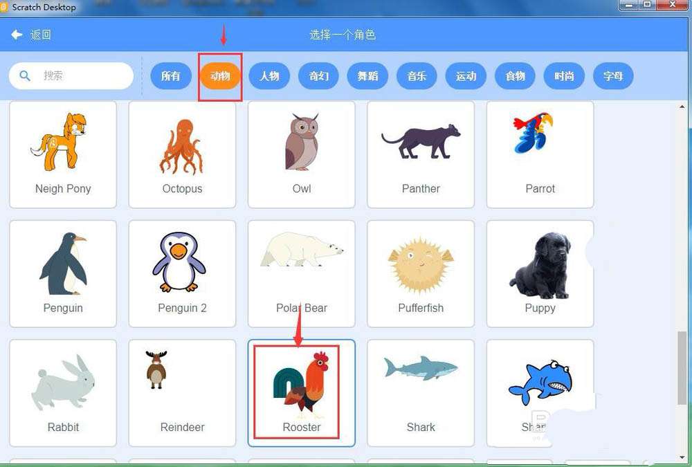 4、进入scratch3.0的选择一个角色页面,在动物类别中点击选中大公鸡;