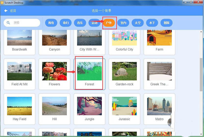 7、点击户外类别,选中森林图片,按确定;