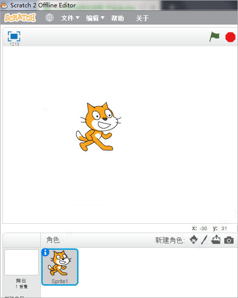 1、首先我们需要运行打开scratch,然后需要准备一个角色(软件已经帮我们备好一个默认角色了,使用这个就可以了,如果你有其他需要也可以进行替换)