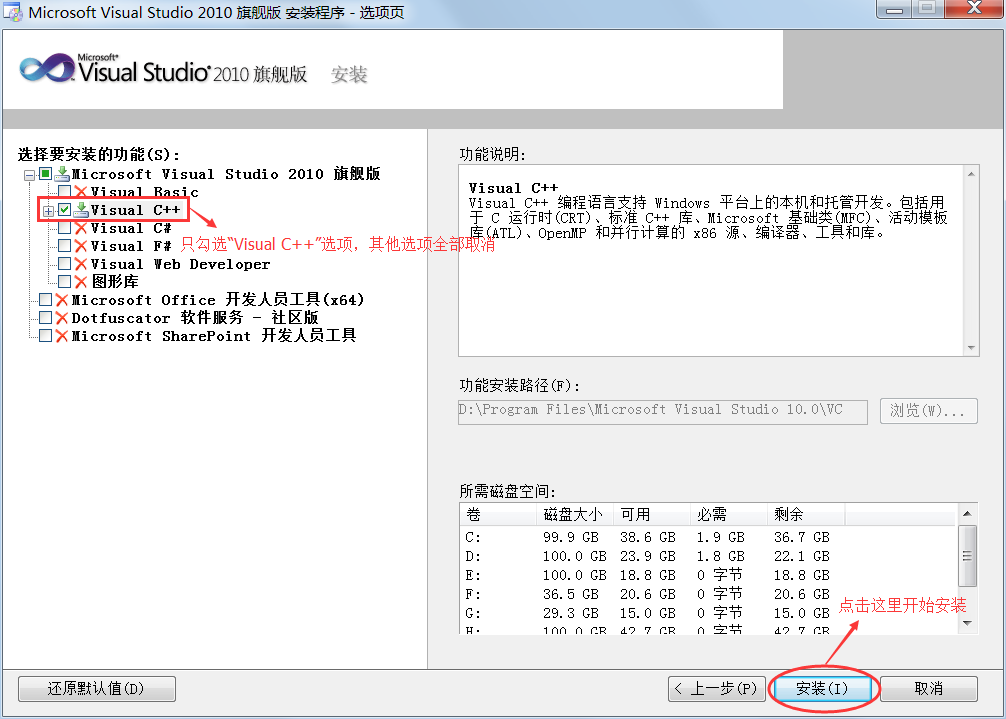 我们不需要 VS2010 的全部组件,只需要与 C/C++ 相关的组件,所以这里只选择了“Visual C++”,将其它用不到的组件全部取消勾选了。