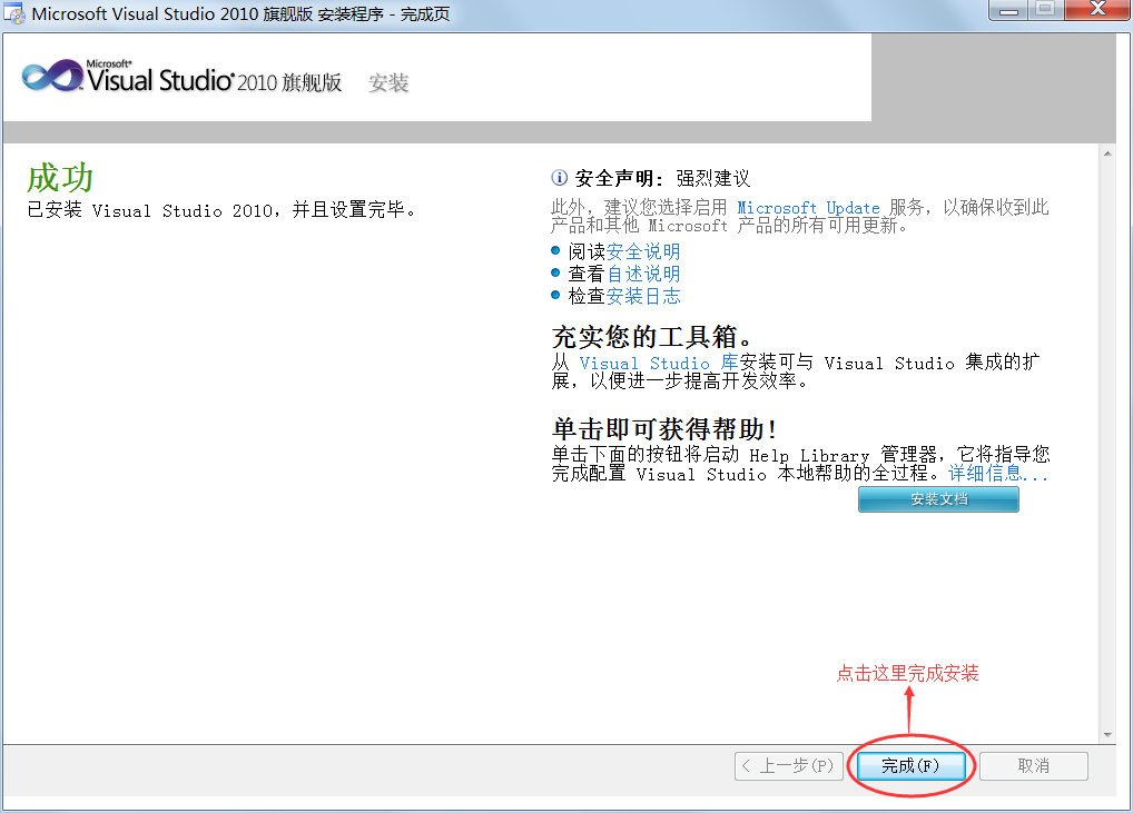 所有的组件安装完成后,VS2010 就安装成功了,点击“完成”按钮即可。