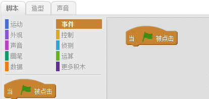 3、然后点击角色图标,开始编写代码。点击【事件】中的“当 被点击”拖动到右半部空白区域,指程序开始运行