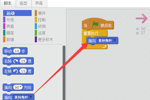 5、拖动【移动】中的【面向鼠标指针】到【重复执行】里面
