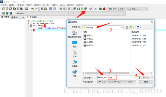 按照上面这一幅图的步骤,先重新编译文件,由于这是一个空的源文件,它会提示你先保存成一个.cpp源文件,所以自己找一个自己知道的位置,写好这个文件的命名即可,记住,文件名后面的后缀是.cpp,这样软件才能编译这个文件