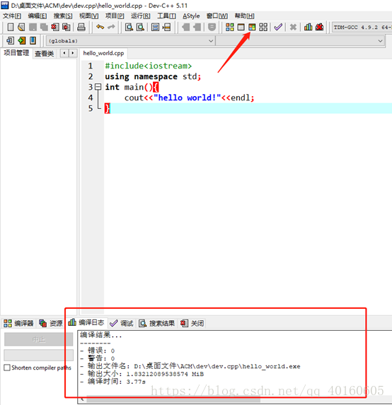 注意左上角新建一个源文件,在建好的界面下写下程序猿的hello world哈哈哈