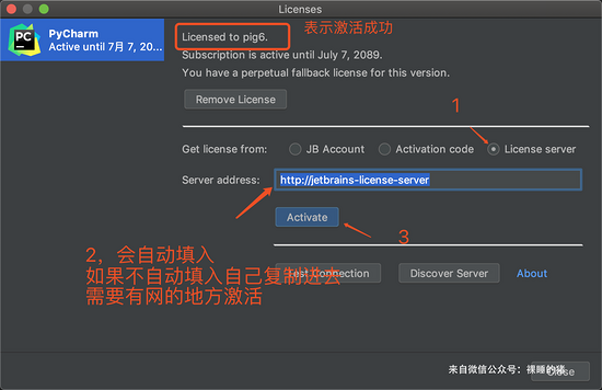 2)选择最后一种License server激活方式,地址填入: http://jetbrains-license-server (应该会自动填上),或者点击按钮:”Discover Server”来自动填充地址,完成激活。