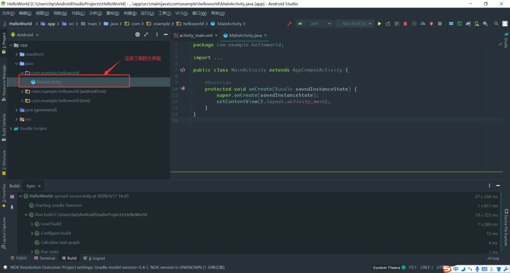 6、打开包名下面的“MainActivity”,就是我们项目的主界面。