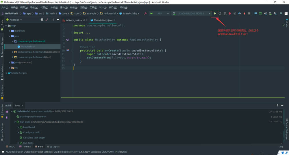 7、连接手机,打开USB调试,点击“Run”图标,会自动安装。