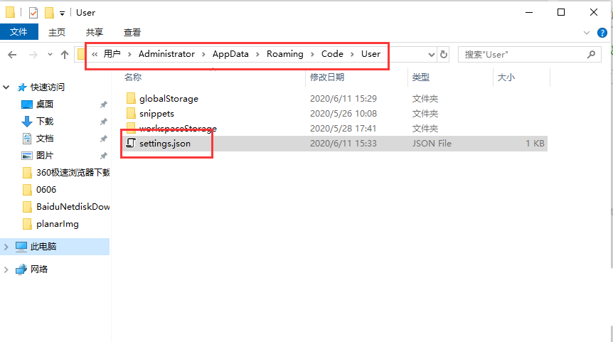 “C:\Users\Administrator\AppData\Roaming\Code\User”,默认在此路径下可以找到 settings.json 文件,直接打开即可。