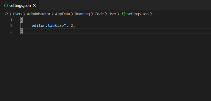 例如配置 Tab 键的空格数量,输入“"editor.tabSize": 2,”
