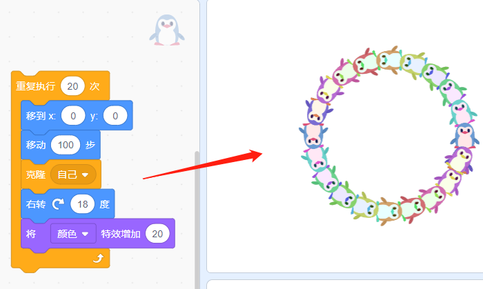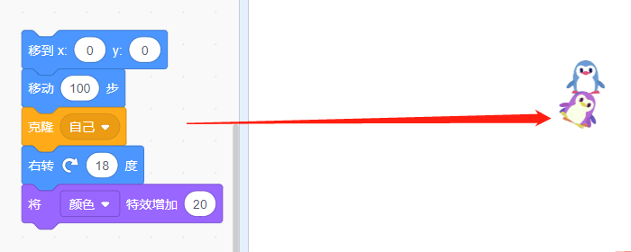 5、这段代码,我们多执行一次,就能看到小企鹅复制出来了2只。两只小企鹅相差18度。将颜色特效增加20以此来改变每只企鹅的颜色。