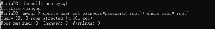 4、输入mysql -uroot 登录数据库(第一次登陆密码为空,不用输入),登陆后切换数据库:use mysql,设置密码:update user set password=password(“root”) where user=“root”;
