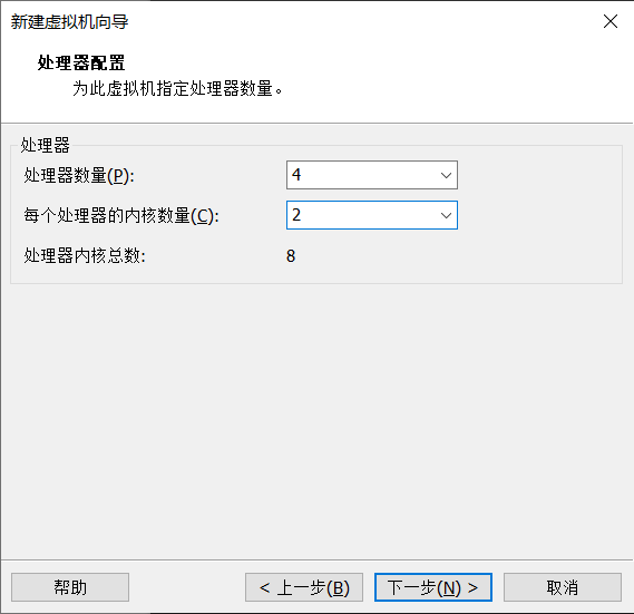 然后选择分配给虚拟机的CPU核心数,要根据自己的电脑进行配置,建议尽量接近物理机的CPU核心数,但不能超过。我的电脑是6核心12线程的CPU,这里我选择分配给我的虚拟机4核心8线程的处理能力。