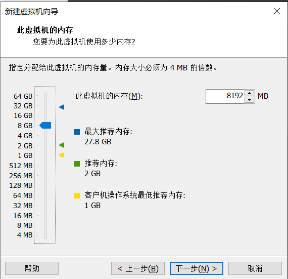 接下来设置分配给虚拟机的内存大小。如果你的物理机内存是8G,那么建议给虚拟机分配4G的内存。如果你的物理机内存更大,那么建议分配8G的内存给虚拟机。分配过多的内存是没有必要的。