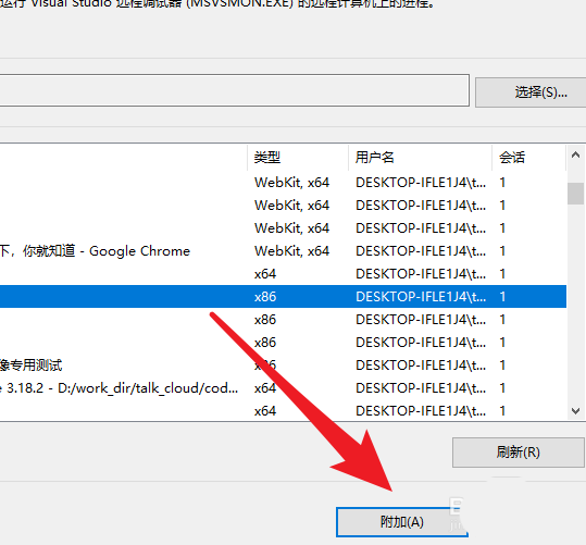 2、弹出下拉菜单栏,选择【附加到进程】选项
