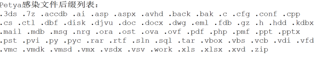 Petya加密的文件类型一共65种,WannaCry为178种,不过已经包括了常见文件类型。