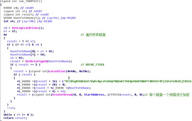 首先,函数sub_10001EEF是加密操作的入口。遍历所有磁盘,对每个固定磁盘创建一个线程执行文件遍历和加密操作,线程参数是一个结构体,包含一个公钥和磁盘根路径。