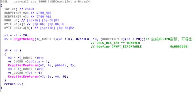 调用sub_10001B4E,通过CryptGenKey生成AES128密钥,用于后边进行文件加密。