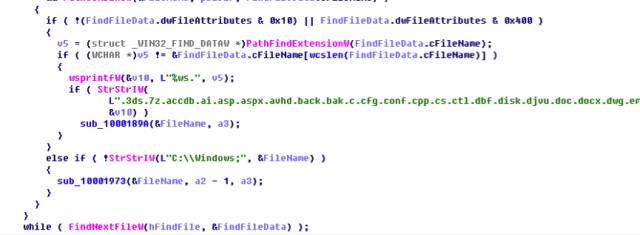 在sub_10001973函数中判断了只对特定文件后缀加密。