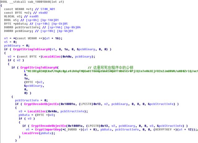 该函数在开始时调用了sub_10001BA0获取一个程序内置的公钥
