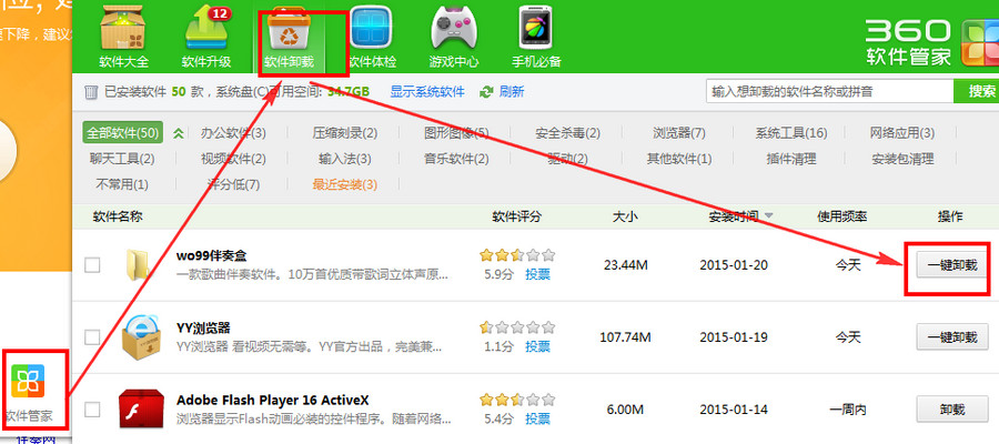 方法一:首先装了360安全卫士的朋友,点击“软件管家”===“软件卸载”===“一键卸载”