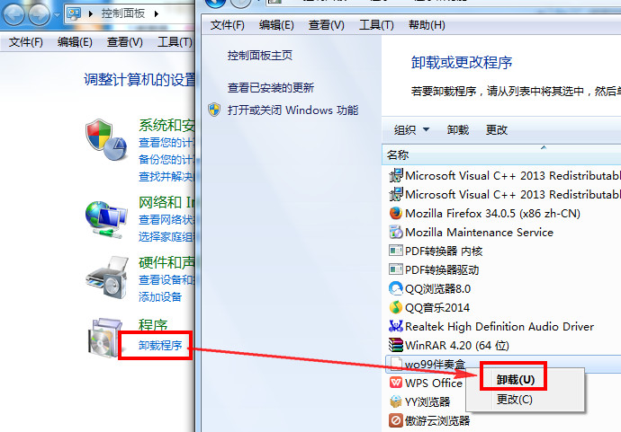 方法二:点击“开始”==“卸载程序”==找到“wo99伴奏盒”==右击==“卸载”