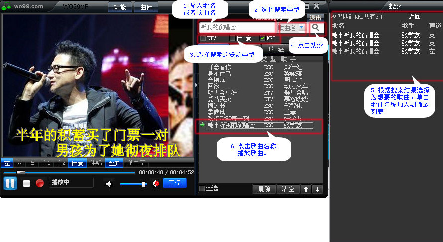 1、打开wo99伴奏盒,10万首优质带歌词立体声原版伴奏,9万首高品质KSC伴奏以及歌词,大家可以按照图上标示步骤操作
