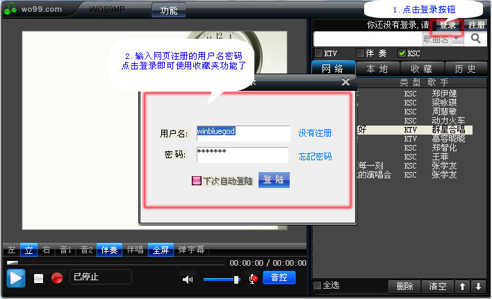 2、首先登录,在线收藏夹功能,无论何时何地轻松调出自己的伴奏