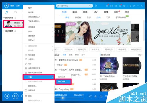 右键点击默认列表中的歌曲,在右键菜单中点击【工具】-【格式转换】;