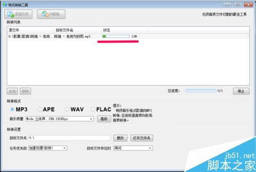 此时需要转换的歌曲便显示在格式转换工具窗口的转换列表中。点击:转换格式【MP3】,确定目标文件夹,【任务优先级】我们可以选择:加速处理或资源优先,【目标文件存在时】可以选择:重命名、询问或覆盖,最后点击:转换文件;