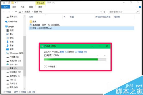 在电脑的本地磁盘G中,显示了转换的歌曲:老地方的雨.mp3,点击便可以播放,把随身听的SD卡插入读卡器再插入电脑,我们可以把转换的歌曲发送到随身听的SD卡中。