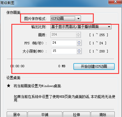 4、在“高级截图”的“图片保存格式”中选择“GIF动画”,之后再设置一下动图的帧数、大小以及保存位置等,设置完毕后点击“开始创建GIF动画”就可以了。