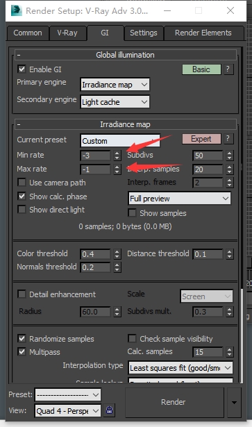 最小比率:定义场景中的平坦的区域(如大面积的墙体,天花等)采用样本的最小数量。值为0表示每一个像素点使用一个样本,值为-1表示每两个像素点使用一个样本,值为-2表示每4个像素点使用一个样本,依次类推。值越小渲染速度越快。