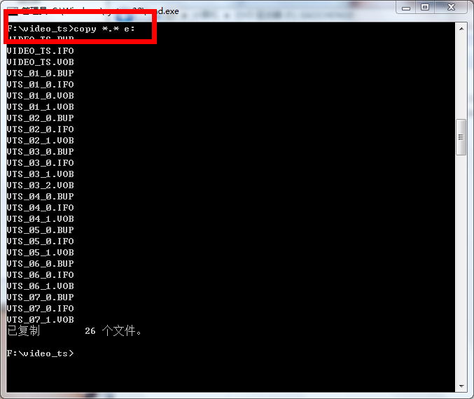 开始菜单,运行“CMD”进入DOS命令行,先进入“F:”盘,然后进入“F:\video_te”目录,在把这个目录下的所有文件复制到E盘(硬盘)具体方法如下: