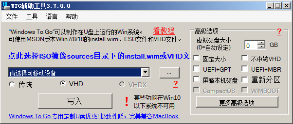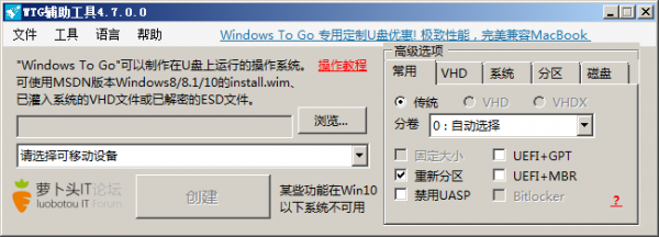 虚拟硬盘磁盘大小:针对VHD(X)模式,创建的VHD磁盘大小。对于扩展式VHD,这是最大大小设定值。设定为0 ,则按照优盘实际容量自动调节。有关VHD模式更多信息,请看:http://bbs.luobotou.org/forum.php?mod=viewthread&tid=5964